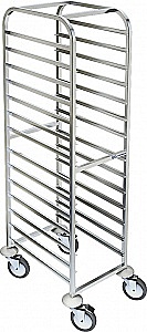 Стеллаж для кухонной посуды. Каркас и полозки из нержавеющей стали AISI 304, 14 уровней для 14 гастроемкостей GN 1/1. Шпильки имеют цельносварную конструкцию, полностью изготовлены из пищевой импортной нержавеющей стали марки AISI 304. Стойки из нержавеющего импортного профиля 20х20, укомплектованы обрезиненными поворотными колёсами диаметром 125 мм - два колеса с тормозом и пластиковым отбойником. Данные стеллажи используется в кухонных цехах для временного хранения и межцеховой транспортировки полуфабрикатов и готовой продукции, а также в расстоечных шкафах. Шпилька имеет 14 уровней. Вместимость 14 гастроемкостей GN-1/1.