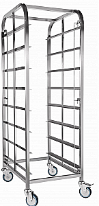 Тележка изготовлена из нержавеющей стали. Имеет четыре поворотных колеса, два из которых оборудованы стопором.