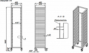 н/ст,450х450х1900мм,сварная конструкция,26 уровней направляющих под противень 406х440мм (в комплект не входят),ширина направляющих 40мм,каркас труба 20х20мм,4 колеса (2 колеса с тормозом) d=100мм,загрузка по узкой стороне