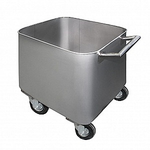 Тележка чан для фарша применяется для внутренней транспортировки пищевого сырья (в частности, мяса) и загрузки его, к примеру, от разделочного стола до мясорубки и далее, в различное технологическое оборудование. Использование тележек помогает сократить, а то и вовсе ликвидировать перевалочные операции в производственном цикле, значительно уменьшить потери сырья, создает условия для механизации ручного труда при транспортировке сырья. Тележка чан для фарша выполнена из нержавеющей стали, емкостью 100 л.