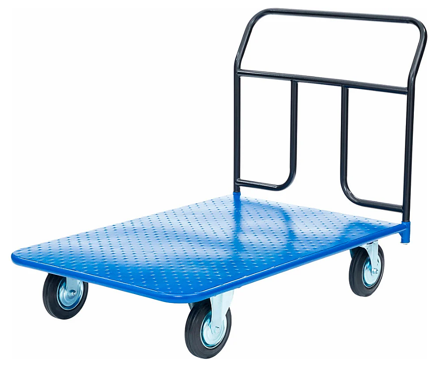 Платформенная 4-х колесная тележка используется для перемещения различных грузов в складских помещениях. Ручка крепится к платформе болтами, для компактного хранения можно снять, высота ручки 750 мм. Платформа имеет уникальную рельефную, полимерную, противоскользящую поверхность, размером 800х1200 мм. Цвет - синий, шагрень. Для легкого перемещения тележка КП-500-200-К комплектуется двумя поворотными и двумя неповоротными колесами, изготовленными из высококачественной литой резины, диаметром 200 мм, комплектом крепежа. Грузоподъемность до 550 кг.
