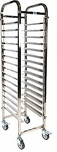 Транспортировочные тележки PJ15 предназначены для использования в кондитерских цехах и пекарнях для транспортировки и краткосрочного хранения полуфабрикатов и готовой продукции на противнях размером 330х460 мм. Противни заказываются дополнительно. Загрузка противней по узкой стороне. Имеет 15 уровней направляющих, с шагом 85 мм, четыре поворотных колеса, два из которых с тормозами.