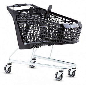 Прочное шасси из плоских овальных труб. Мелкоячеистая корзина из пищевого пластика с детским сиденьем и круглой трубчатой ручкой. Пластиковые дефлекторные кольца серого антрацита 7016.