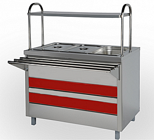 Паровой нагрев, на 4 GN 1/1, с гастроемкостями. Целиком облицован нержавеющей сталью, в комплекте полка, направляющие.
