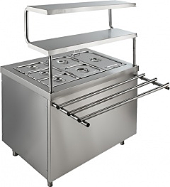 Мармит вторых блюд предназначен для демонстрации, кратковременного хранения и раздачи посетителям вторых блюд и соусов в горячем состоянии. Над мармитом расположена двухуровневая полка, на которой размещаются порционные блюда. Мармит комплектуется гастроёмкостями.