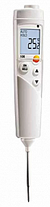 Термометр Testo 106 - электронных измеритель для контроля температуры в жидкостях, сыпучих, вязких, полужидких и мягких средах. Прибор оборудован несъемным тонким погружным зондом, сигнализатором и большим дисплеем.