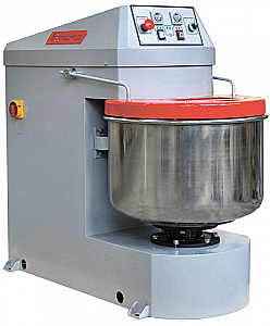 Схема замеса: спиральный месильный орган, центральный отсекатель, стационарная вращающаяся цилиндрическая дежа из нержавеющей стали емкостью 70 литров .