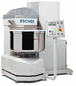 Двухмоторная спиральная тестомесильная машина со стационарной дежой с гидравлическим подъемником для выгрузки на стол.