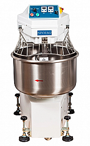 Тестомес спиральный SINMAG серии SМ 50 используется на предприятиях общественного питания и торговли для замешивания теста различной плотности, перемешивания соусов и начинок. Замешивание теста осуществляется одновременным вращением спирали и дежи. Модель оснащена электромеханической панелью управления и таймером.