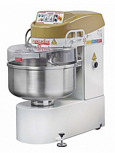 Усиленный корпус устройства исполнен из нержавеющей стали AISI 304. Основа, устанавливаемая на 2-х ножках с фиксаторами и 2-х колесиках, обеспечивает идеальную устойчивость и простоту передвижения. Чаша, объемом 250 л, и все соприкасающиеся с тестом детали выполнены из нержавеющей стали. На передней панели размещена электромеханическая система управления, включающая в себя кнопку включения, кнопку выключения, кнопку аварийной остановки, вариатор скоростей и два таймера.