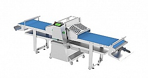 Тестораскаточная машина R65AXP-T с основой на колёсах, изготовлена из нержавеющей стали, полностью автоматизирована, доступна в версии со встроенной системой нарезки (R65AХ-PT).