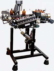 Этикетировочная машина выполнена в виде напольной рамы, на которой смонтированы: узел нанесения этикетки, с двумя или одной этикетировочными головками, узел перемещения тары, финишный транспортер возврата тары с нанесенной этикеткой к рабочему месту оператора, блок управления. Узел перемещения тары, в зависимости от формы тары и длины этикетки включает в себя: