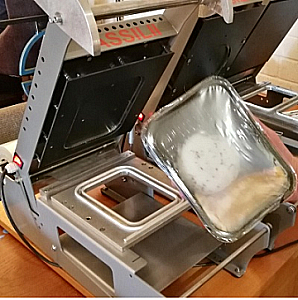 Предлагаемый аппарат производит запайку и обрезку пленки по контуру лотка 187х137 мм одновременно. Смена матриц не возможна, аппарат работает только с одним типом лотка. Максимально возможно использовать лоток высотой 110 мм.