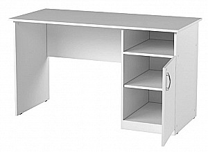 Габаритные размеры (ШxГxВ): 1300×600×750 мм. Изготовлен из ЛДСП. В стол встроена тумба в виде ниши с 2-мя полками, 1 из которых съемная. Полки делят тумбу на 3 секции. Две нижние секции закрыты дверцей.