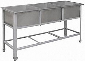 Ванна моечная двух- и трехсекционная, каркас разборный. Ванны сварные, выполнены из нержавеющей стали марки AISI 304 толщиной 0,8 мм и имеют по периметру подогнутую кромку для предотвращения травматизма персонала. Каркас выполнен из оцинкованной стали толщиной 1,2 мм. Стойки каркаса представляют собой уголок 40х40 мм с фальцованными краями для увеличения жесткости конструкции и исключения травмоопасности. Под ванной установлены два уголка из оцинкованной стали толщиной 1,2 мм. Щель между ваннами закрыта оцинкованной панелью. Снизу каркас усилен четырьмя перемычками из оцинкованной стали толщиной 1,2 мм. Опорные ножки регулируются по высоте в пределах 20 мм и изготовлены из нержавеющей стали с пластиковой подложкой внизу для предотвращения повреждения пола. В комплект входят две системы разрыва струи. Все ванны имеют стандартную высоту 870 мм