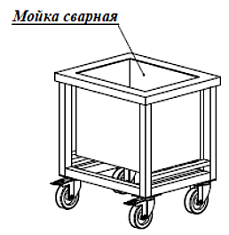 Неразборная, борт, одна сварная мойка 460х360х400 в центре, без отв. под смеситель, штуцер 3/4, 4 колеса усиленные, поворотные, 2 колеса с фиксатором, обвязка с 4-х сторон, столешница – металл AISI 304, профиль 40х40