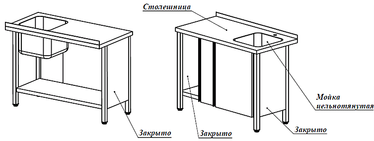 Неразборная, борт, одна цельнотянутая мойка 400х400х300 справа, отв. под смеситель, двери-купе - 2 шт., полка-дно, модуль закрыт слева и справа, столешница – металл AISI 304, профиль 40х40, чертеж 4241П-19_03_28-ВМ - СТАНДАРТ