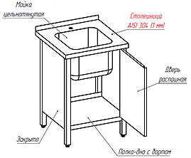 Неразборная, борт, в центре цельнотянутая мойка 500х500х300 мм, отв. под смеситель, закрыта с 2-х сторон, полка-дно, дверь распашная, петли справа, столешница aisi 304,профиль 40*40, чертеж 4228П-19_03_28-ВМ - СТАНДАРТ