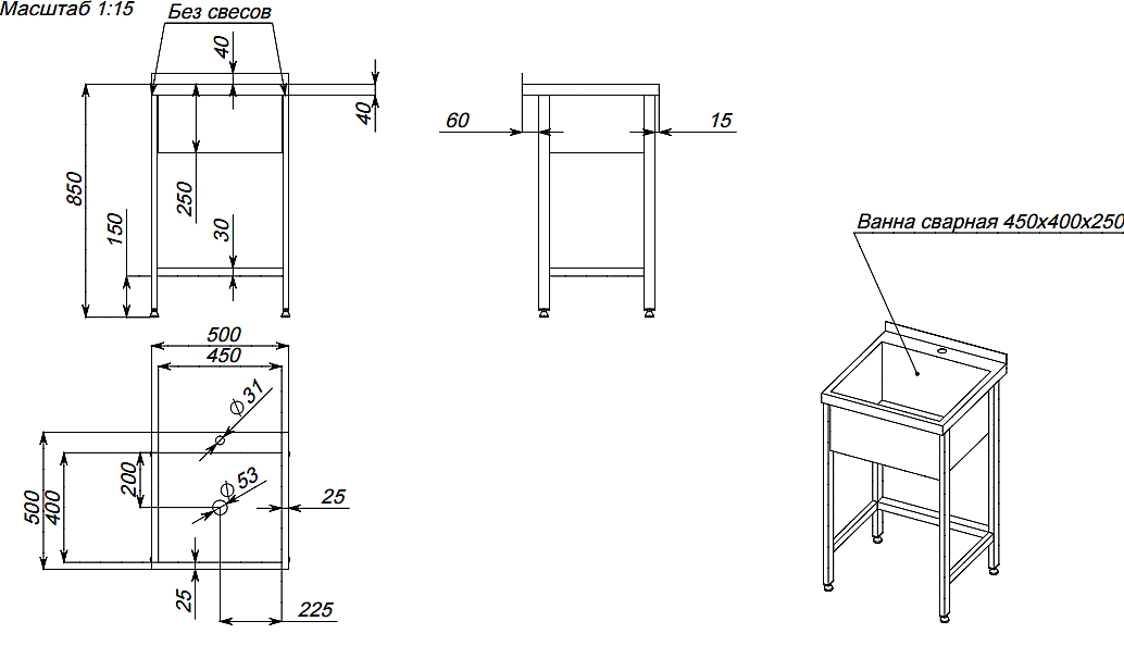 н/ст,500х500х850мм,обвязка с 3-х сторон,сварная конструкция,каркас труба 20х40мм,1 сварное моечное отверстие 450х400х250мм,без фартука,в комплекте сифон,регулируемые ножки,без боковых свесов,отступ ног сзади 60мм