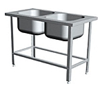 н/ст, толщина столешницы - 1 мм, разборная конструкция, каркас - уголк 40*40*1,5 мм, Hстолешницы -40 мм, без борта, 2 цельнотянутые емкости : 400*400*250 мм при глубине изделия 600 мм; 500*500*300 мм при глубине изделия 630 мм и выше, с диаметром сливного отверстия 54 мм, без отверстия для смесителя, регулируемые ножки(+/-20мм)