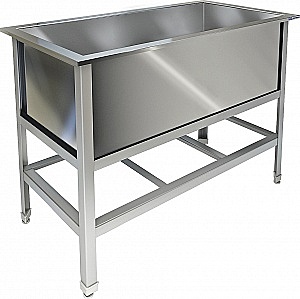 Одна емкость сварная размером 1240х600х450 из нержавеющей стали марки AISI 304 толщиной 0,8 мм. Каркас сварной из уголка 40х40 нержавеющей стали марки AISI 430 толщиной 2 мм, внизу по периметру обвязка. Ванна комплектуется выпуском с нержавеющей решеткой и механическим запорным клапаном, диаметр выпуска 9 0мм, диаметр подключаемого сифона 50 мм, регулируемые опоры. На дне ванны ребра (лучи) для жесткости и снижения вибрации. Ванна поставляется в собранном виде.