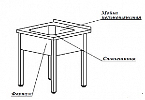 Разборная, борт, одна цельнотянутая мойка 500х500х300 в центре (слева/справа), отв. под смеситель, фартуки с 4-х сторон, столешница – металл AISI 304, профиль 40х40