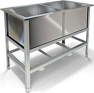 Две сварные емкости размером 700х700х450 из нержавеющей стали марки AISI 304 толщиной 0,8мм, крыло. Каркас сварной из уголка 40х40 нержавеющей стали марки AISI 304 толщиной 2мм, внизу по периметру обвязка. Ванна комплектуется выпуском с нержавеющей решеткой и механическим запорным клапаном, диаметр выпуска 90мм, диаметр подключаемого сифона 50мм, регулируемые опоры. На дне ванны ребра (лучи) для жесткости и снижения вибрации. Ванна поставляется в собранном виде.