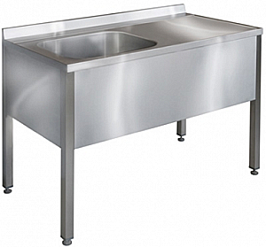 Каркас разборный из нержавеющей трубы 40х40мм. Обнижение по периметру, объемный борт. Гладкая рабочая поверхность из нержавеющей стали. Сталь AISI 304. Ножки регулируются по высоте.