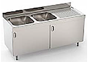 Столешница под мойку с раздвижными дверцами из нержавеющей стали AISI 304. Штампованная столешница с 2 раковинами, с поддоном справа. Переливной слив в комплекте.