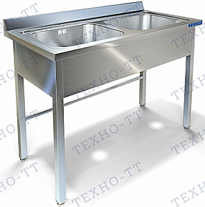 Ванна моечная цельнотянутая из нержавеющей стали AISI 304 (2 ёмкости), размер ёмкости 500/500/300, каркас сварной из нержавеющей стали AISI 304 (труба), фартук с трех сторон, выпуск 90, перелив