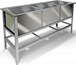 Три сварные емкости размером 430х430х300 из нержавеющей стали марки AISI 304 толщиной 0,8мм, крыло. Каркас сварной из уголка 40х40 нержавеющей стали марки AISI 304 толщиной 2мм, внизу по периметру обвязка. Ванна комплектуется выпуском с нержавеющей решеткой и механическим запорным клапаном, диаметр выпуска 90мм, диаметр подключаемого сифона 50мм, регулируемые опоры. На дне ванны ребра (лучи) для жесткости и снижения вибрации. Ванна поставляется в собранном виде.
