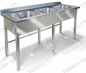Ванна моечная цельнотянутая из нержавеющей стали AISI 304 (3 ёмкости), размер ёмкости 500/500/300, каркас сварной из нержавеющей стали AISI 304 (труба), фартук с трех сторон, выпуск 90, перелив