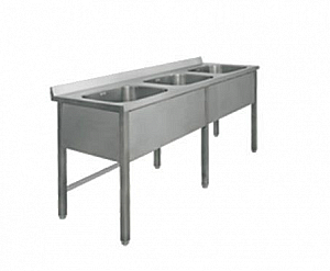 Три цельнотянутые емкости размером 600х600х330 из нержавеющей стали марки AISI 304 толщиной 1мм, обнижение 2мм. Объемный пристенный борт высотой 70мм. Фартук с 3-х сторон высотой 285 мм. Каркас сварной из трубы 40х40 нержавеющей стали марки AISI 304 толщиной 1,2мм, перелив. Ванна комплектуется выпуском с нержавеющей решеткой и механическим запорным клапаном, диаметр выпуска 90мм, диаметр подключаемого сифона 50мм, регулируемые опоры. На дно ванны нанесена виброшумоизоляция. Ванна поставляется в собранном виде.