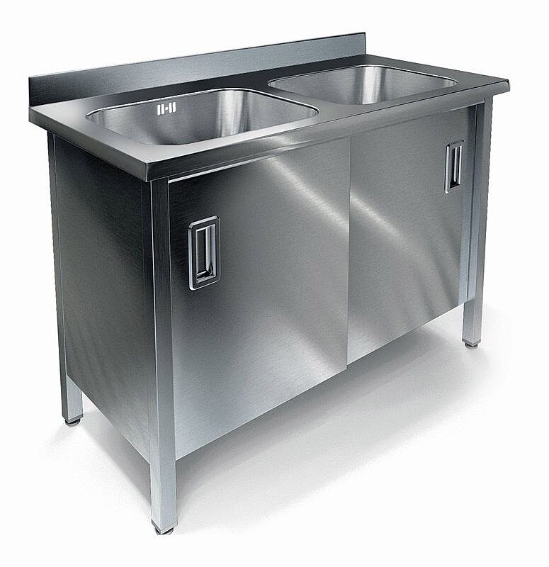 1200х600х850, ванна цельнотянутая из стали AISI 304 (2 емк.)400х400х250, каркас сварной из стали AISI 430, толщина 1,2 мм, рабочая поверхность из нержавеющей стали AISI 304, толщиной 1 мм, борт плоский 70 мм, двери купе, диаметр отверстия 32мм