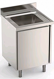 Ванна моечная с распашной дверцей, изготовлена из нержавеющей стали AISI 304. Прессованная рабочая поверхность с одной раковиной 400x500x250 мм. Переливной слив в комплекте