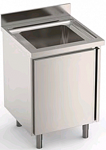 Ванна моечная с распашной дверцей, изготовлена из нержавеющей стали AISI 304. Прессованная рабочая поверхность с одной раковиной 500x500x300 мм. Переливной слив в комплекте