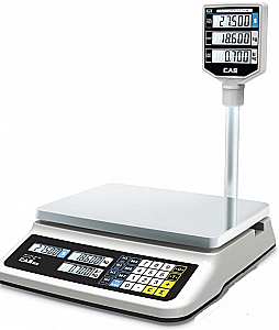 Двусторонний ЖКИ дисплей с подсветкой, нержавеющая платформа, 7 клавиш быстрого доступа, расчет сдачи, 6 разрядов для введения цены, индикатор разрядки АКБ и спящий режим, порт RS-232C