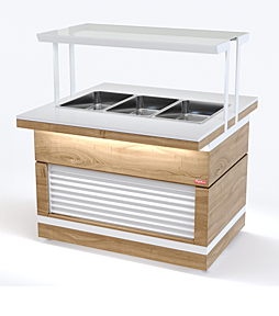 Прилавок холодильный относится к Шведским столам «Filin» торговой марки «Refettorio». Предназначен для кратковременного хранения, демонстрации холодных блюд, закусок и салатов. Класс прилавка высокотемпературный (от 1° до 10). Холодообеспечение встроенное. Тип оттаивания: естественный. Исполнение - островное. Столешница из искусственного камня. Прилавок оснащён стеклянными полками. Максимальная распределенная нагрузка на полку 10кг. Имеет светодиодную подсветку ниши фасадной части и подсветку рабочей зоны. Фасадные части могут быть только с жалюзи. В стандартный комплект поставки гастроёмкости и боковые фасады не входят (доп. опция).