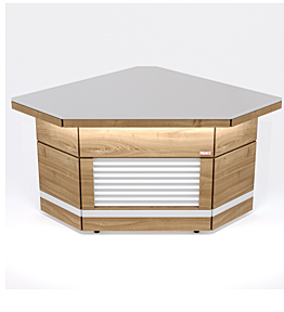 Прилавок нейтральный угловой относится к относится к Шведским столам «Filin» торговой марки «Refettorio». Используется для удобства комплектации модулей под углом 90 градусов в линию прилавков, является промежуточным вспомогательным элементом. Исполнение - островное. Столешница из искусственного камня. Имеет светодиодную подсветку в фасадной части.
