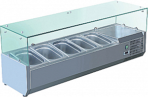 Ппрямое стекло, корпус-нержавеющая сталь, вместимость 5хGN1/4 (гастроемкости в комплект не входят), статическое охлаждение, электронный термостат и цифровой дисплей, делители в комплекте, климатический класс до +32С