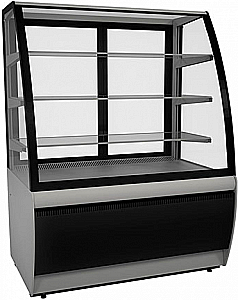 Витрина остеклена со всех сторон стеклопакетами, обеспечивающими отличную защиту от теплого воздуха. Фронтальное стекло изогнутое. Есть подсветка внутреннего пространства, причем светодиодами подсвечивается каждая полка. У модели необычная для кондитерских витрин, черно-серая цветовая гамма, на фоне которой сладости выглядят еще красивей и аппетитней.