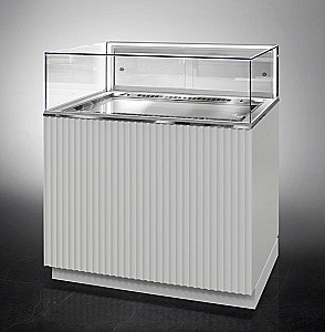 Выкладка продуктов для демонстрации осуществляется на дно и промежуточную полку витрины.