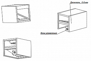 ЭСКИЗ,н/ст,AISI 430 1мм,400Х600Х400мм,сварная конструкция,закрыта по бокам,полка под наклоном с переставными делителями из прутка d-8мм,1 керамический инфракрасный излучатель,до t+60С;