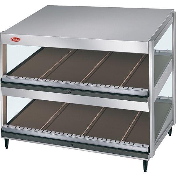 Витрина тепловая с 2 наклонными полками открыта с фронтальной и задней сторон и предназначена для хранения пиццы, пирожков, попкорна, чипсов начос и пр. в упаковке. В комплекте 16 разделителей (по 8 для каждой полки). Ширина и количество отсеков на полке регулируются. Средняя ширина отсека при использовании всех разделителей - 114мм. Полезная высота между первой и второй полкой - 212мм, между второй полкой и верхом - 208мм. Полки могут вмещать ёмкости размером 457х660м. Витрина имеет подогреваемое основание с твёрдым покрытием, верхний инфракрасный нагреватель, 6 небьющихся ламп накаливания (по 3 над каждой полкой) для подсветки демонстрируемой продукции. Нагрев основания регулируется термостатом +85/+93С. В комплекте 4 регулируемые ножки высотой 102мм. Высота витрины указана с учётом высоты ножек. Витрина изготовлена из алюминия и нержавеющей стали, боковые панели – из закалённого стекла. Возможна окраска витрины в другие цвета (оплачивается дополнительно) - красный, черный, серый, белый, синий, зеленый, медный.