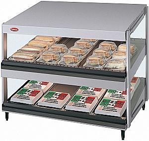 Витрина тепловая с 2 наклонными полками открыта с фронтальной и задней сторон и предназначена для хранения пиццы, пирожков, попкорна, чипсов начос и пр. в упаковке. В комплекте 20 разделителей (по 10 для каждой полки). Ширина и количество отсеков на полке регулируются. Средняя ширина отсека при использовании всех разделителей - 117мм. Полезная высота между первой и второй полкой - 212мм, между второй полкой и верхом - 208мм. Полки могут вмещать ёмкости размером 457х660м. Витрина имеет подогреваемое основание с твёрдым покрытием, верхний инфракрасный нагреватель, 8 небьющихся ламп накаливания (по 4 над каждой полкой) для подсветки демонстрируемой продукции. Нагрев основания регулируется термостатом +85/+93С. В комплекте 4 регулируемые ножки высотой 102мм. Высота витрины указана с учётом высоты ножек. Витрина изготовлена из алюминия и нержавеющей стали, боковые панели – из закалённого стекла.