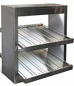 Витрина тепловая настольная открытая с 2 наклонными подогреваемыми полками предназначена для демонстрации и хранения предварительно упакованных продуктов. Витрина изготовлена из нержавеющей стали. В конструкции полки использованы комплектующие ведущих европейских производителей. Благодаря плоским нагревательным элемента на силиконовой основе, достигается равномерность температурного поля по всей поверхности полки. Рабочая температура на каждой полке регулируется отдельно терморегулятором от 30 до 60 град. Расстояние между полками – 280мм. Размер полки - 650х550мм. Подсветка находится над каждой полкой. Полки имеют съёмные направляющие, позволяющие делить поверхность полки на 5 частей разной ширины.