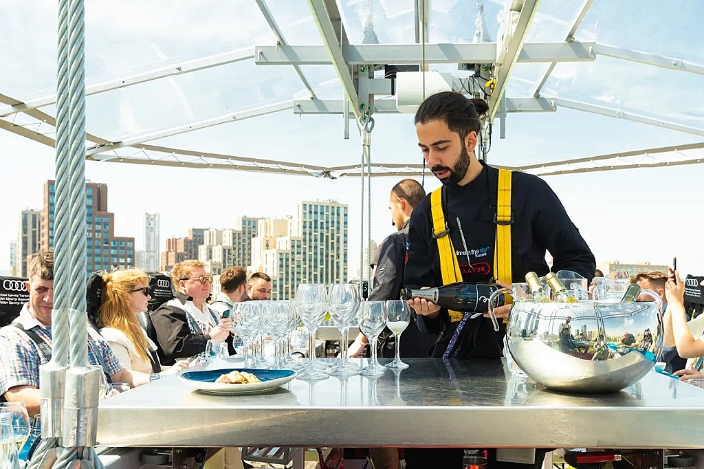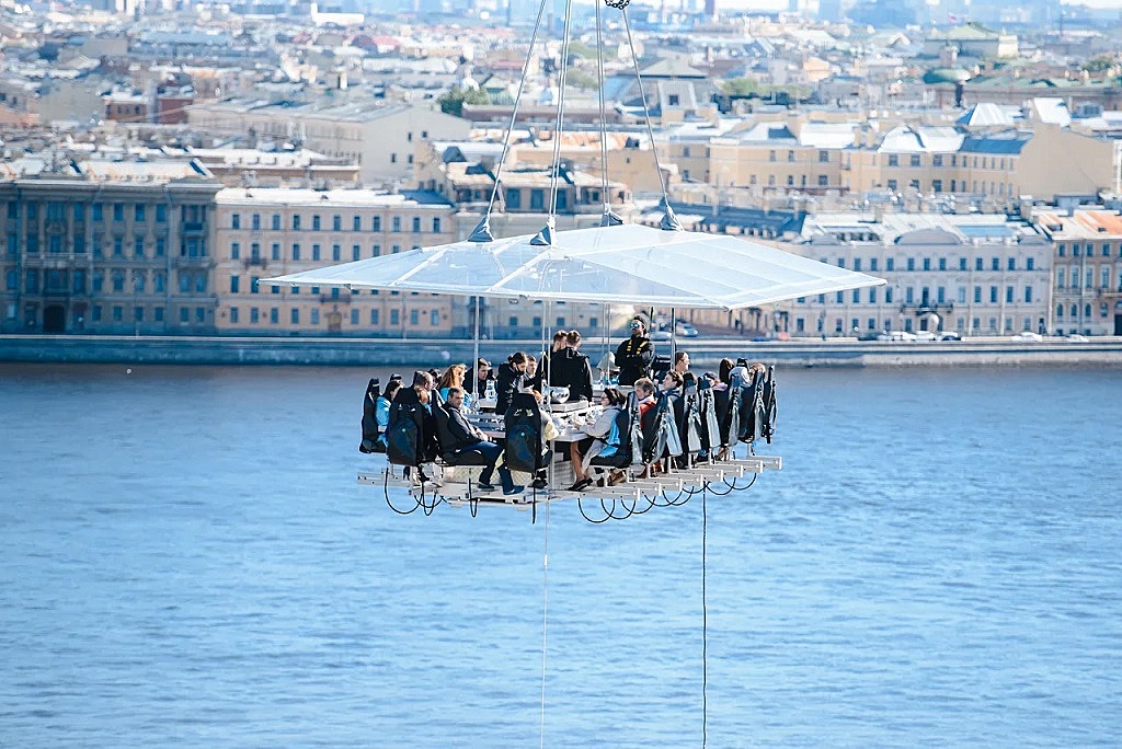 Уникальность Dinner in the Sky® состоит в том, что это в прямом смысле «Ужины в небесах» (а еще завтраки, обеды и коктейли). Высокотехнологичная платформа, оборудованная сиденьями и площадкой для работы шеф-поваров, поднимается на высоту 45-50 метров. Гости наслаждаются трапезой и невероятными видами на достопримечательности города с высоты птичьего полета.