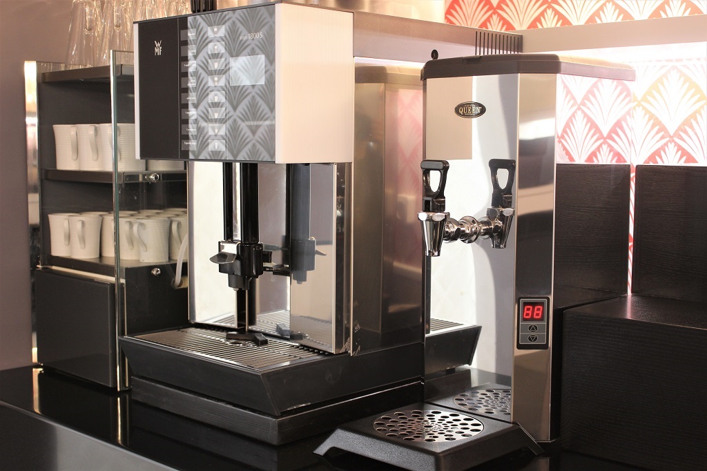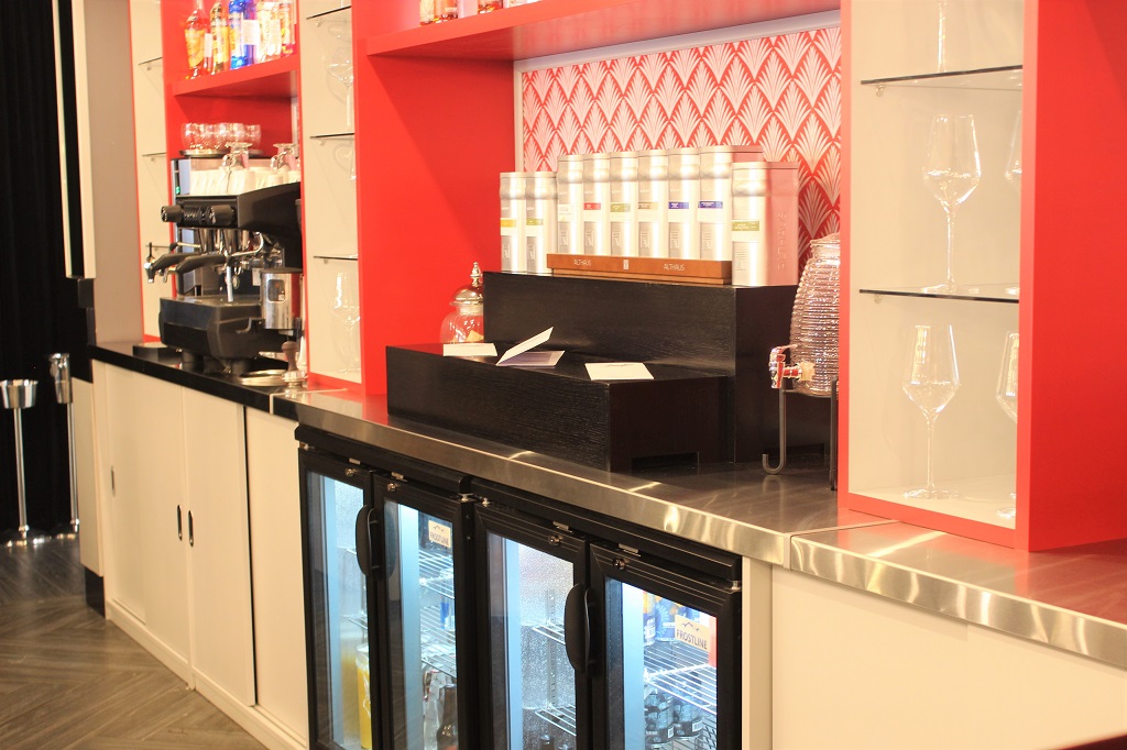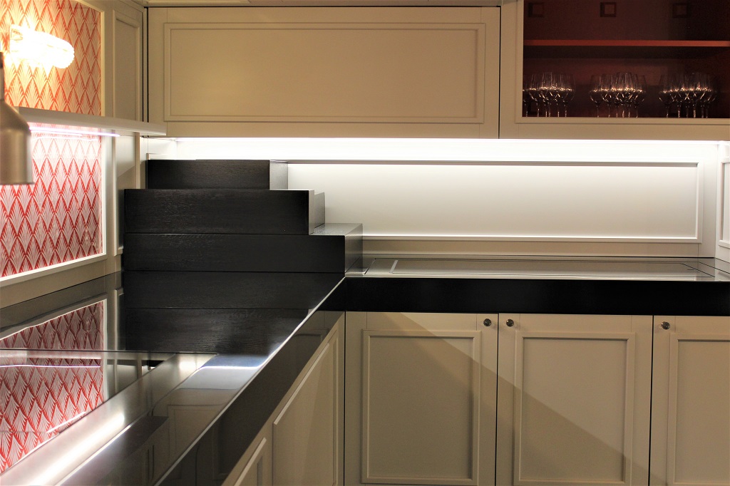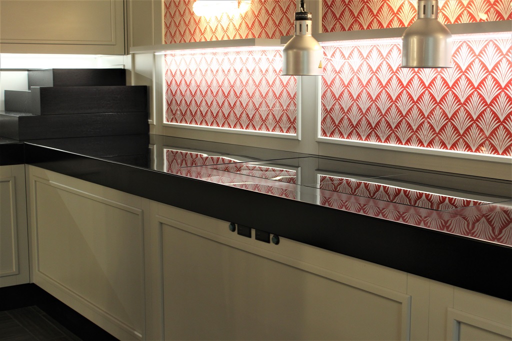 Встраиваемые поверхности стильного черного цвета выполнены из искусственного камня с кварцем. Тепловые и охлаждаемые поверхности – инновационное решение бренда «Энофриго», которое позволяет содержать порционные блюда и подносы при оптимальных температурных режимах, сохраняя их органолептические свойства. Модули с подогревом поддерживают температуру до +80 °С, что делает их прекрасной альтернативой классическим мармитам и стеклокерамическим плиткам. Охлаждаемые – обеспечивают температуру в диапазоне от 0 °С до +4 °С. В отличие от стальных поверхностей они всегда остаются чистыми, эстетически привлекательны, устойчивы к механическим повреждениям. ENOFRIGO может изготовить подобные термо-панели разных цветов и форм по индивидуальному проекту клиента.