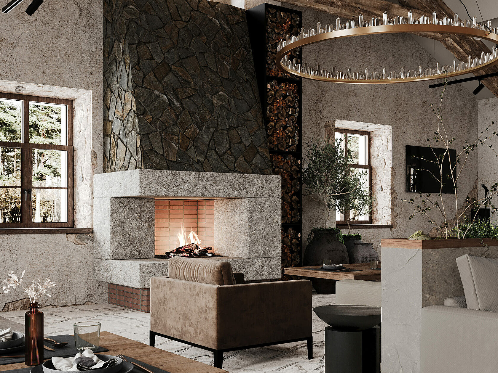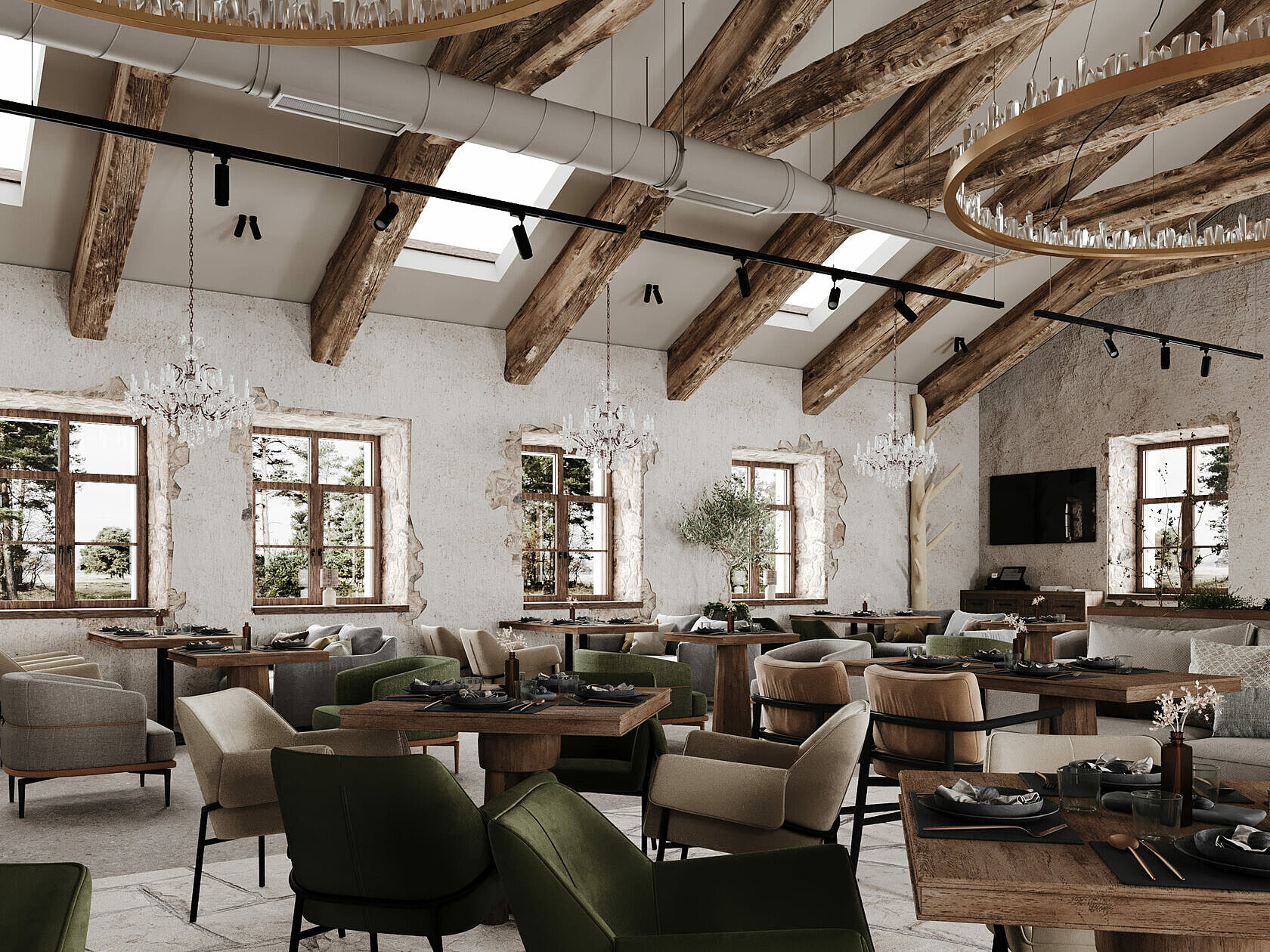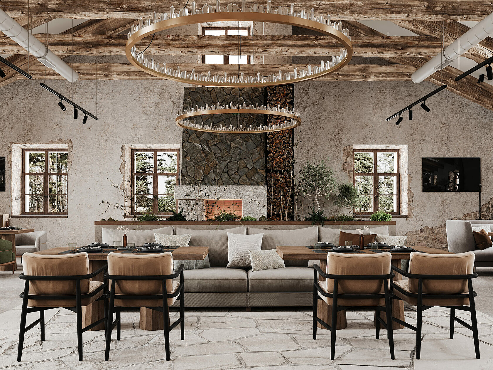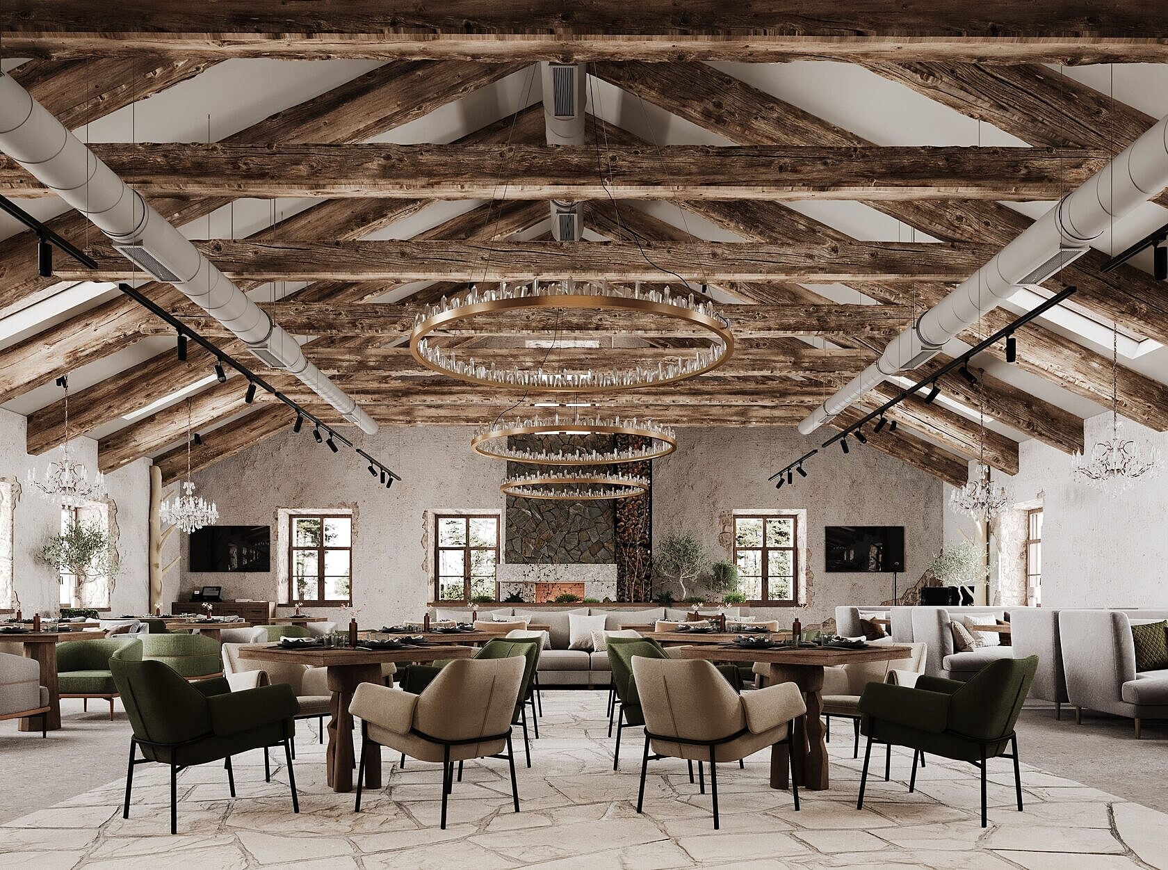 Дизайн-проект разработала петербургская студия с акцентами на псковскую архитектуру. Интерьер соответствует месту и времени, интегрируя элементы стиля лофт в общее пространство. При создании комплекса дизайнеры использовали природные материалы: камень, дерево, металл. При этом предпочтение отдавалось спокойным, приглушенным тонам.