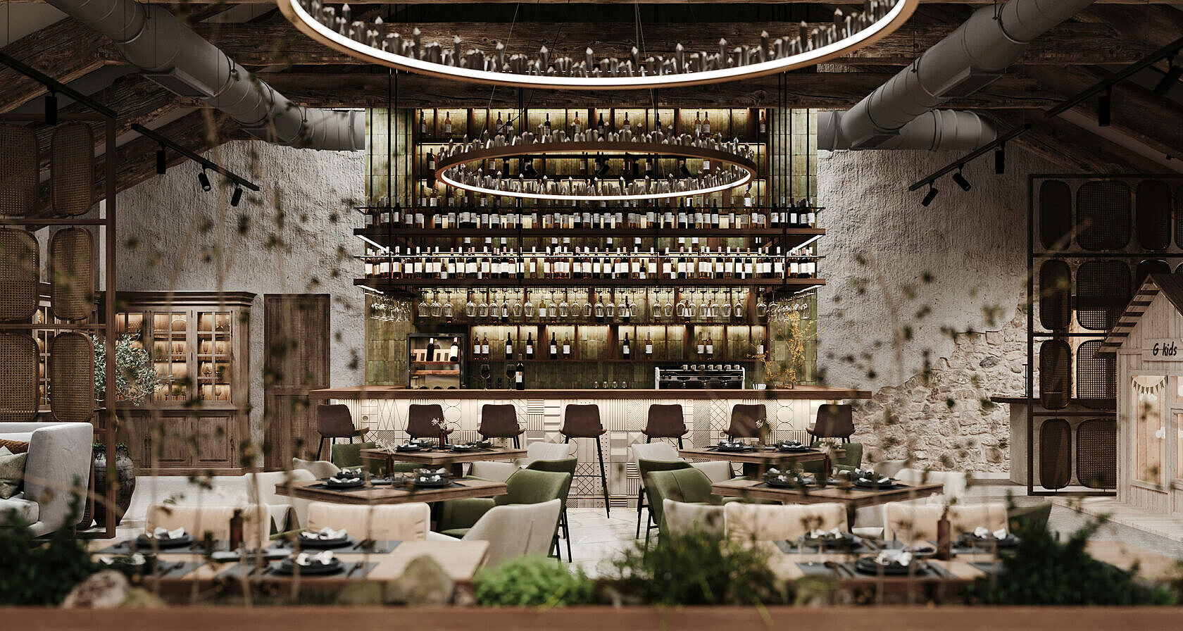 В ресторане есть уютная зона с действующим камином. Найдутся здесь занятия и для самых юных посетителях. Их ждет маленький домик с бизибордом, телевизором и детской кухней. Созданы условия и для маломобильных граждан.